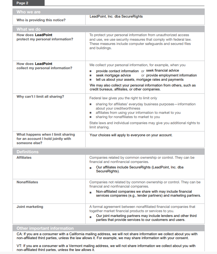 SecureRights is affiliated with LeadPoint, Inc., a Delaware corporation with offices in Plano, Texas and maintains an online marketplace that helps match businesses that provide residential mortgages, debt financing and other financial products and services to consumers who have expressed an interest in seeking such products and services. SecureRights is an independent third party verification service that is dedicated to combating fraud and protecting consumer privacy. When consumers like you seeking financial products and services submit their information through websites prominently displaying the SecureRights logo, we will collect and use personal information about you to respond to your request for such products and services. SecureRights also provides a mechanism for consumers to report fraud or violations of their privacy.