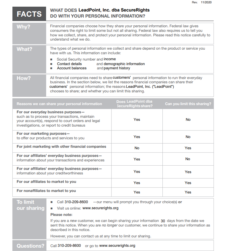 This Privacy Policy explains how LeadPoint, Inc. dba SecureRights (“SecureRights”, ” we,” “our,” or “us”), and related web collects, uses, discloses, and protects information we collect through our online services, websites, mobile applications, and software provided on or in connection with the services and also any and all communications with us via phone, email, text or otherwise (each, a “Service” and collectively, “Services”). Capitalized terms that are not defined in this Privacy Policy have the meaning given to them in our Terms & Conditions.